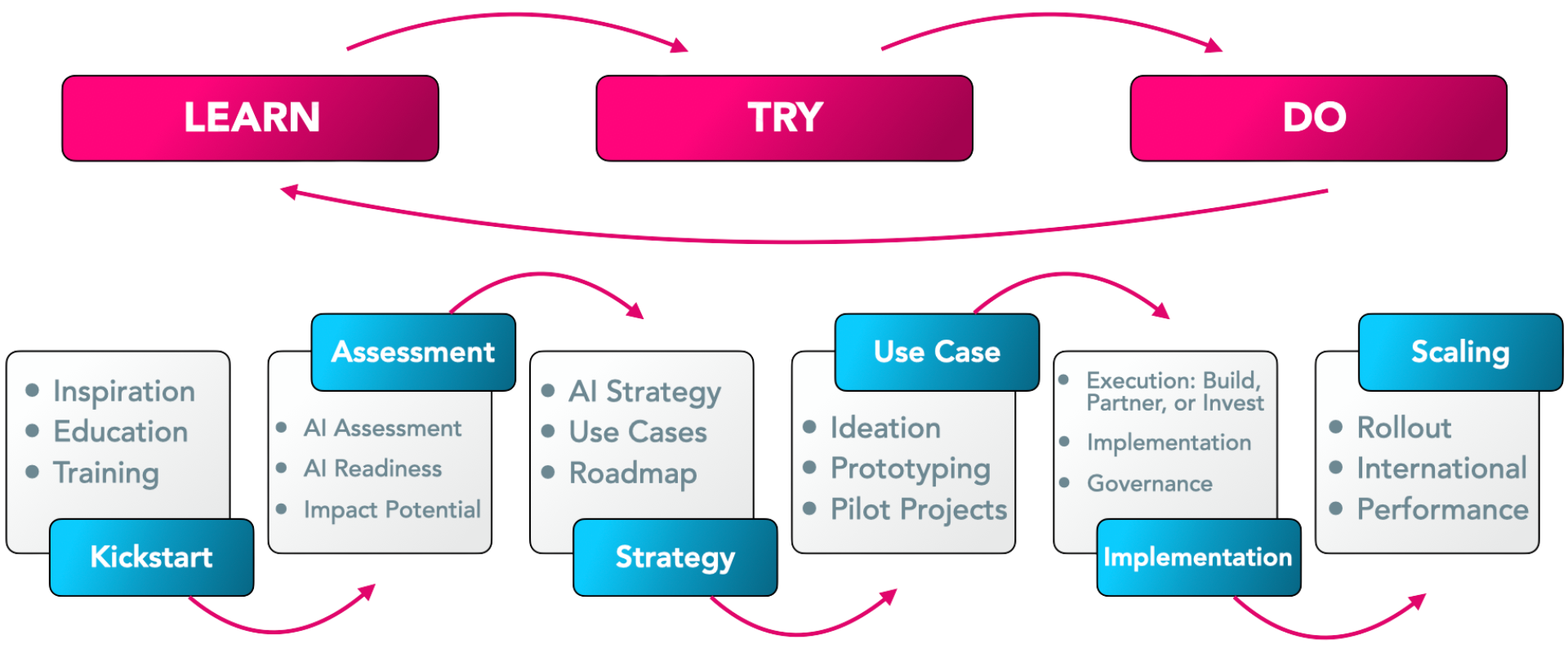 Vom ersten Orientierungsgespräch über Qualifizierung und Use-Case-Priorisierung bis zur Einführung und Skalierung – der AI.HUB bietet an jeder Schnittstelle konkrete Unterstützung und sorgt für nachvollziehbare Fortschritte.